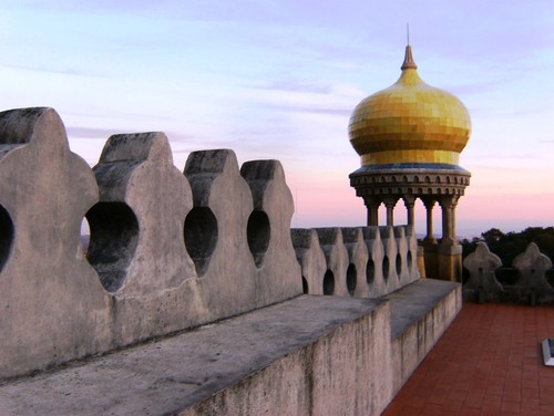 Como já fiz no passado, trago-vos um novo pormenor do Palácio da Pena, desta feita uma clara alusão às características neo-islâmicas, um dos vários estilos que assenta neste carismático palácio. Todas as torres (exceptuando a do Relógio) receberam este tipo de capelas, algo natural em todas as obras manuelinas (a Torre de Belém é outro exemplo desta medida). Além das particularidades manuelinas, a obra dispõe também de características mouriscas e góticas. Edificado em 1839, constitui o mais notável exemplo da arquitectura portuguesa de Romantismo. A 7 de Julho de 2007, este local foi eleito como uma das Sete Maravilhas de Portugal.